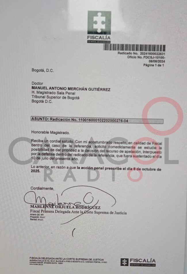 El pasado 8 de agosto la fiscal primera delegada ante la Corte Suprema, Marlenne Orjuela, le envió un oficio al magistrado Manuel Antonio Merchán, en el que pidió “se estudie la posibilidad de dar prioridad a la decisión del recurso de apelación interpuesto por la defensa”, por riesgo de prescripción. ((VER DOCUMENTO))