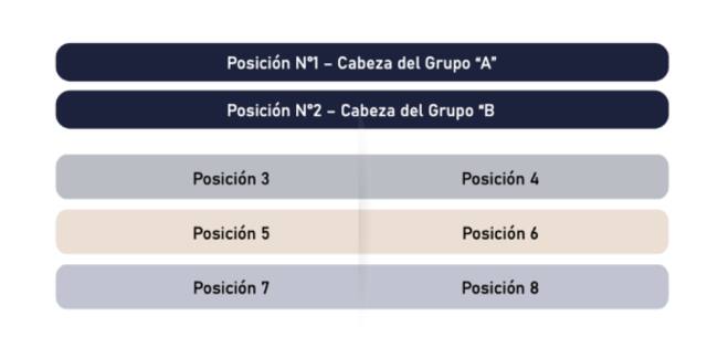 Por su parte, del puesto tres al octavo, serán acomodados en los dos grupos de cuatro equipos cada uno, conforme se realice el sorteo. La localía de los partidos durante las seis fechas (ida y vuelta) también entra en sorteo y, para tener en cuenta, las dos cabezas de serie jugarán la fecha 6 en sus respectivas casas.