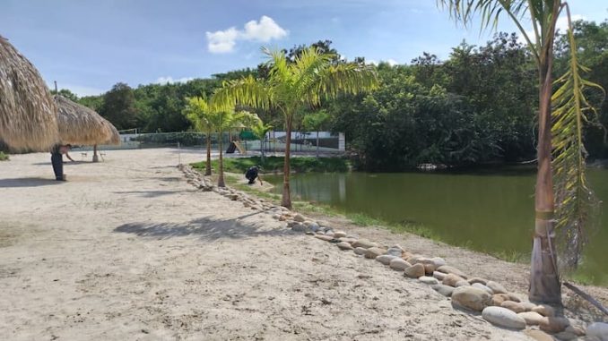 La playa artificial se encuentra a una distancia promedio de 2,5 metros del borde del espejo de agua de la laguna, mientras que dentro de esta misma área se evidenciaron diez kioscos con cubierta en hoja de palma, un parque infantil y un cerramiento en malla metálica, estructuras que se ubican entre 4 y 5 metros del borde de la laguna, todas dentro del área forestal protectora del cuerpo hídrico.
