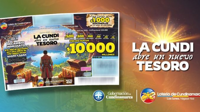 La Lotería de Cundinamarca juega hoy 6 de abril su primer sorteo bajo un nuevo plan de premios, que pone en circulación una bolsa total de $28.071.927.711 pesos. La oferts incluye un premio mayor de $10.000 millones, acompañado de una Balsa Millonaria de $500 millones, un Tunjo de Oro de $300 millones y una Guaca Secreta de $100 millones, además de múltiples premios intermedios.